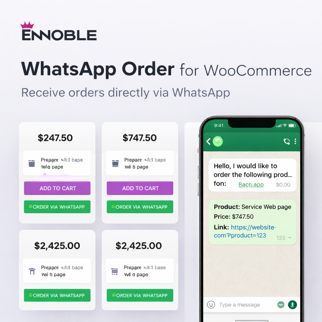 Ennoble WhatsApp Order for WooCommerce allows customers to initiate product orders directly through WhatsApp using a customizable button on product pages and product grids.